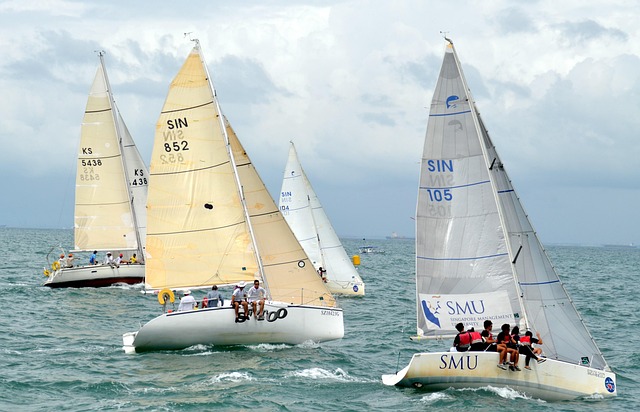 바닷가에서 요트 대회가 열리고 있다. 요트 선수들이 앉아서 쉬고 있다.